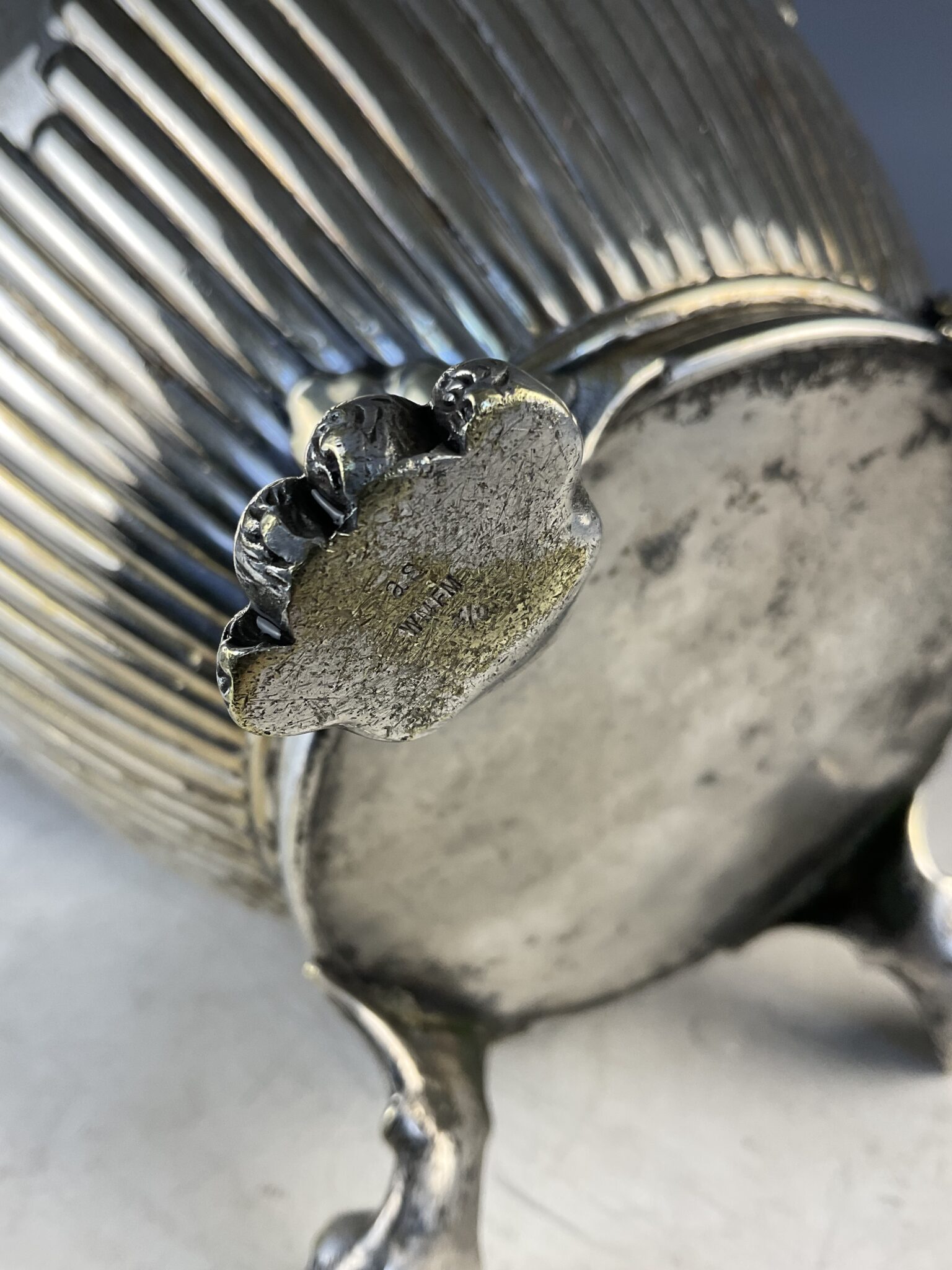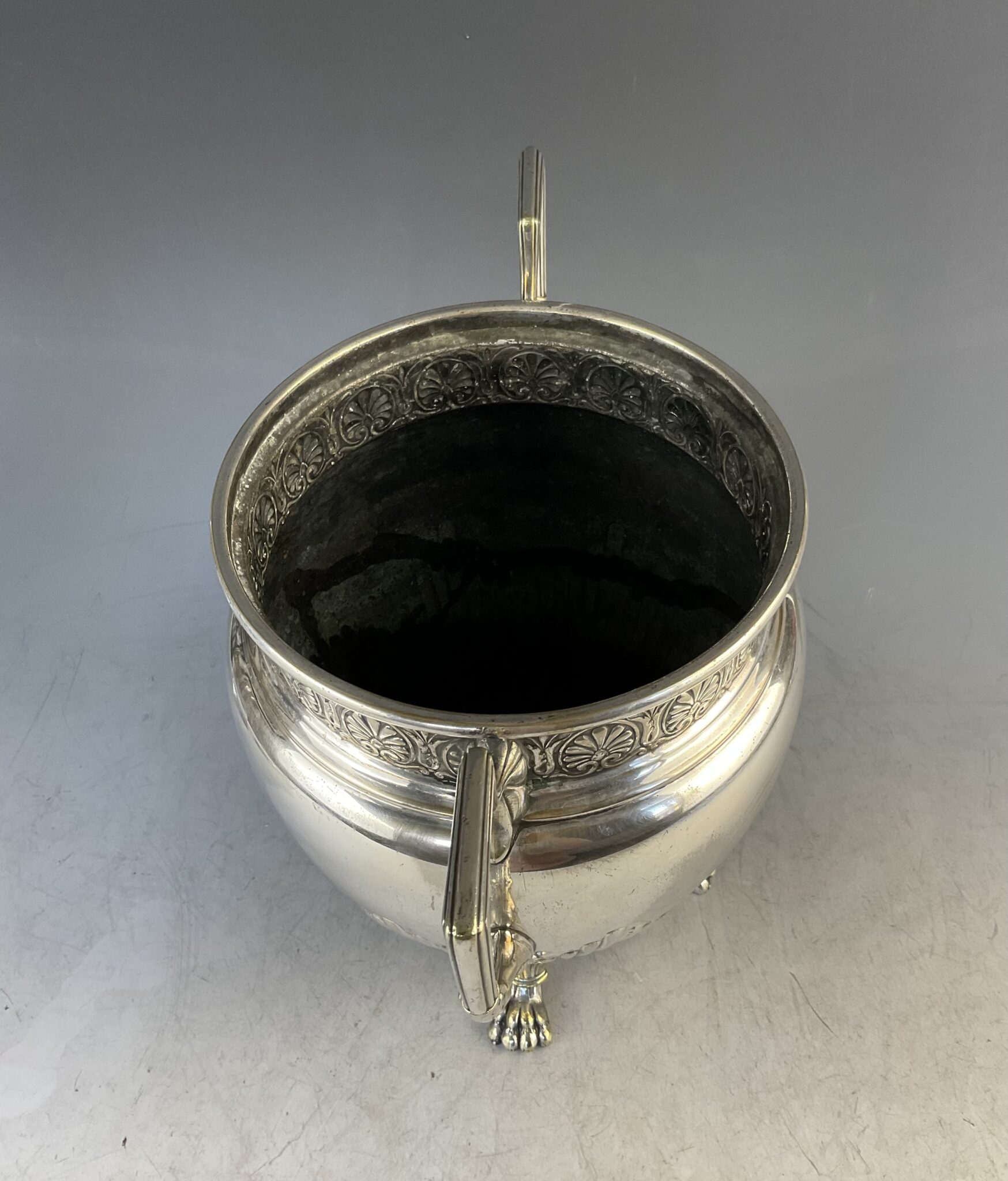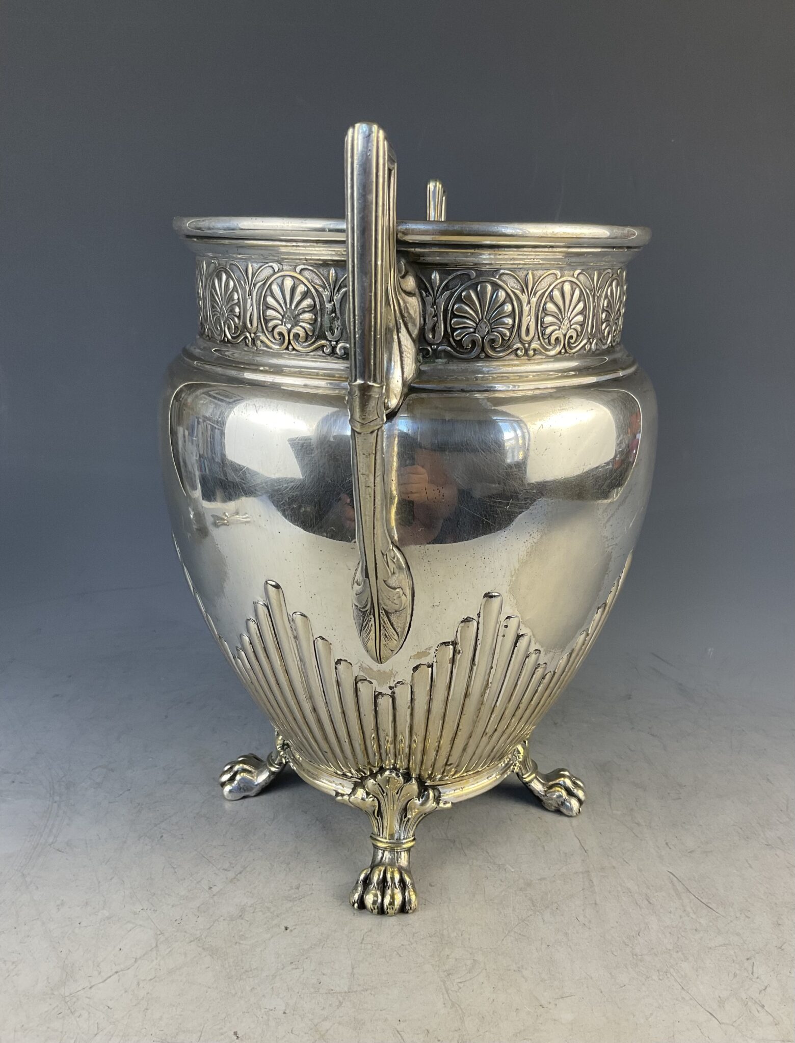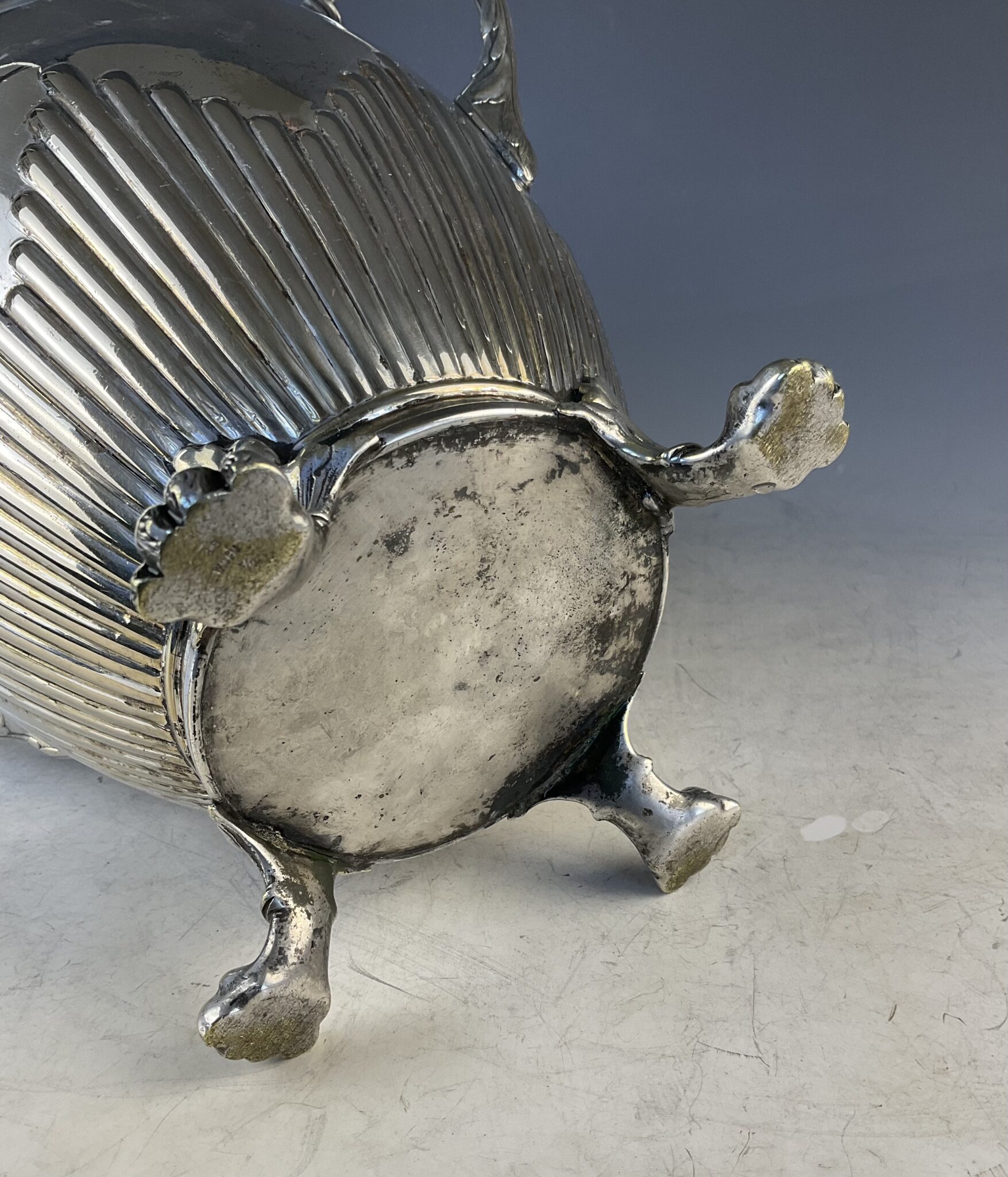 Alpacca, versilbert, runder Gefäßkörper auf drei Prankenfüßen, gebauchte Wandung mit Kanneluren, zwei seitliche Henkel, auf einem Fuss gemarkt WMF, handpolierter Erhaltungszustand mit altersbedingten Gebrauchsspuren und Abrieb