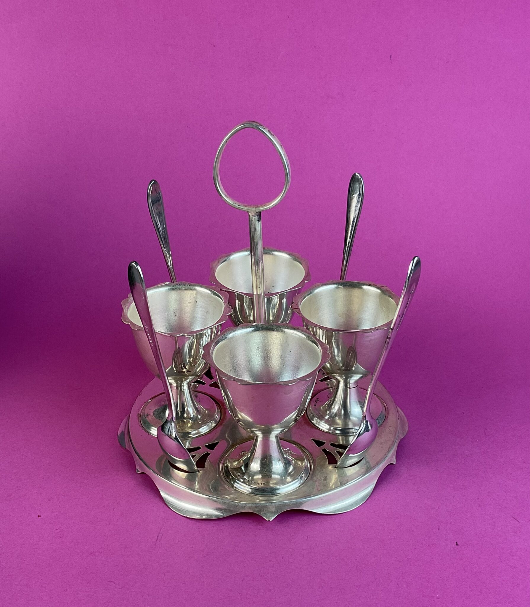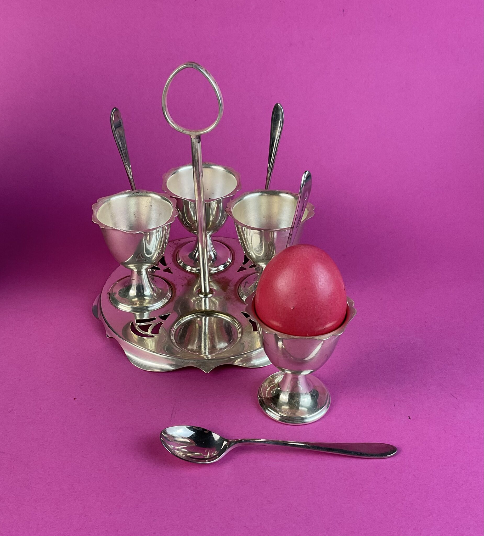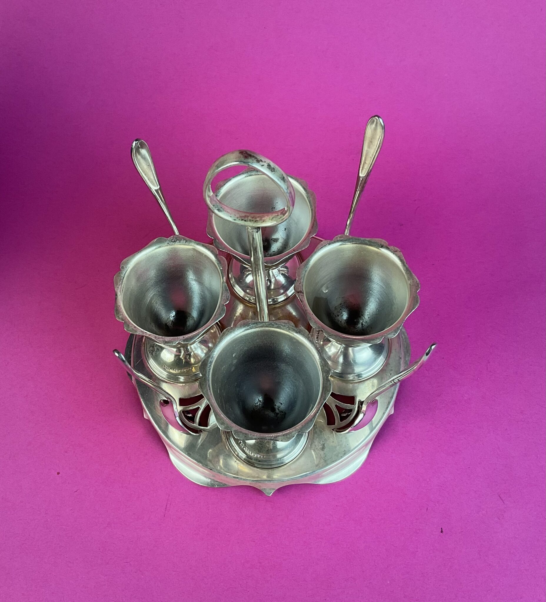 Alpacca, versilbert, quadratischer Ständer auf vier Füßchen, Griffstange, runde Stellflächen für vier pokalförmige Gefäßkörper, Halterung mit vier Eierlöffel, gemarkt Reg. „PLATO MADE IN ENGLAND“, altersbedingte minimale Gebrauchspuren