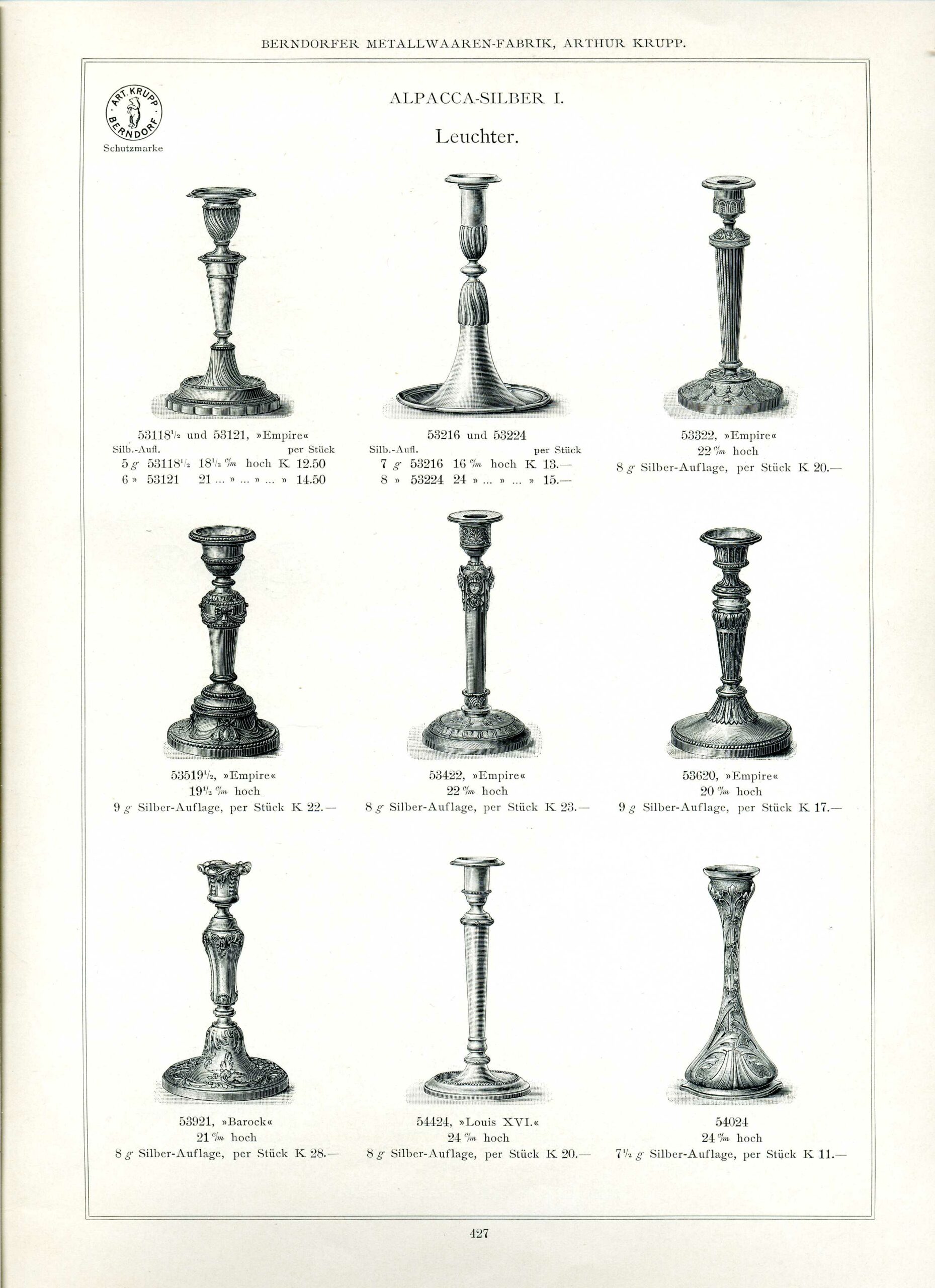 Weiterführende Literatur: Muster- und Preisbuch der Berndorfer Metallwarenfabrik über Bestecke und Tafelgeräte aus Alpacca-Silber I., Arthur Krupp, 1911; Ingrid Haslinger, Tafelkultur Marke Berndorf, Wien 1998 (Ausstellung in der Silberkammer Wien); krupp stadt museum BERNDORF (Hg.), „Berndorfer Silber, Tafeln mit Stil, Besteckkultur von 1843 bis heute“, Berndorf 2007;