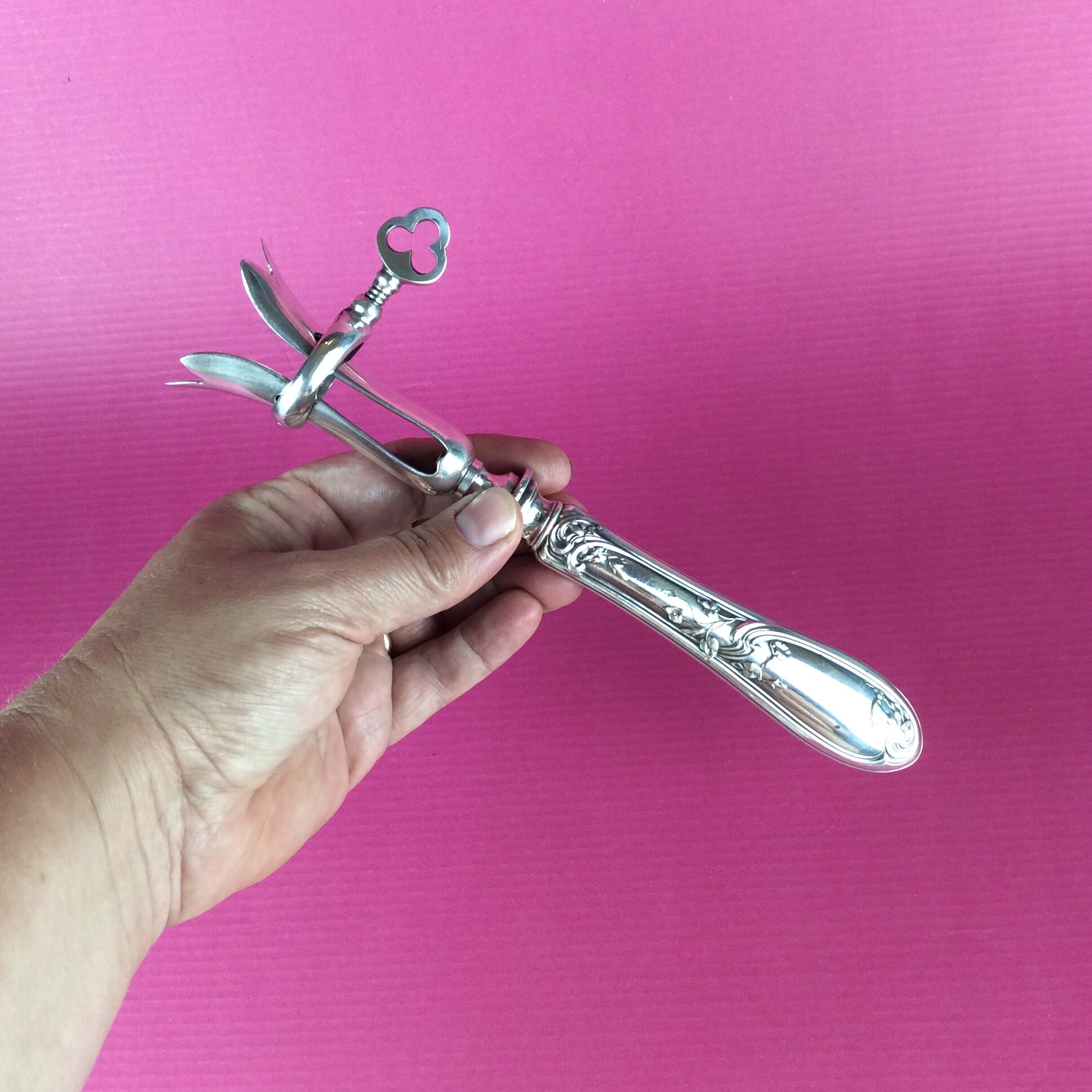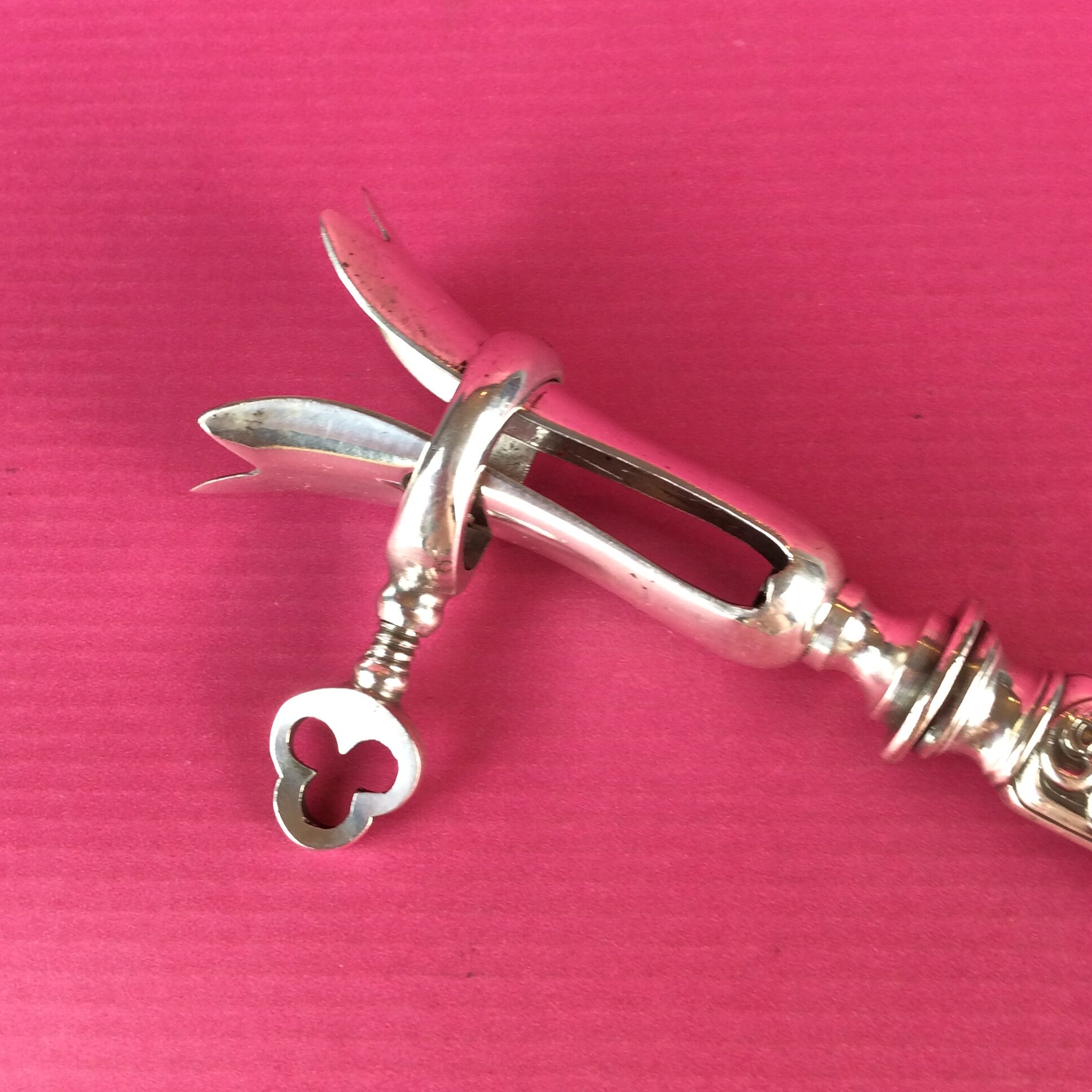 Annettes Etikette: Diese Keulenhalter wurden für das Arretieren von Knochen verwendet. Der französische Begriff „fer à gigot“ oder „manche à gigot“ bedeutet wörtlich „Lammkeuleneisen“. Meist wird dieses Tafelgerät von einem Tranchiermesser und einer Tranchiergabel bei Tisch begleitet.