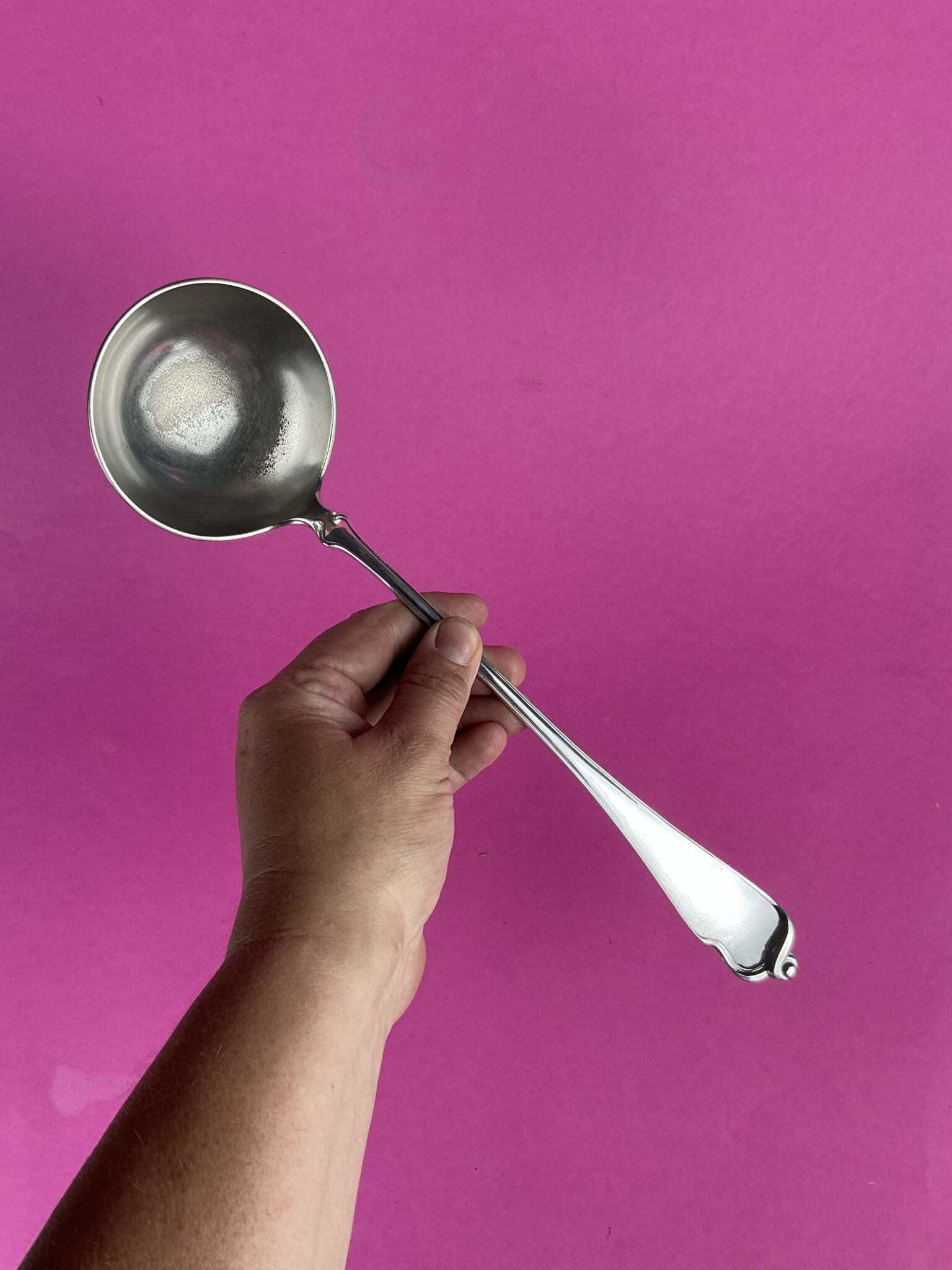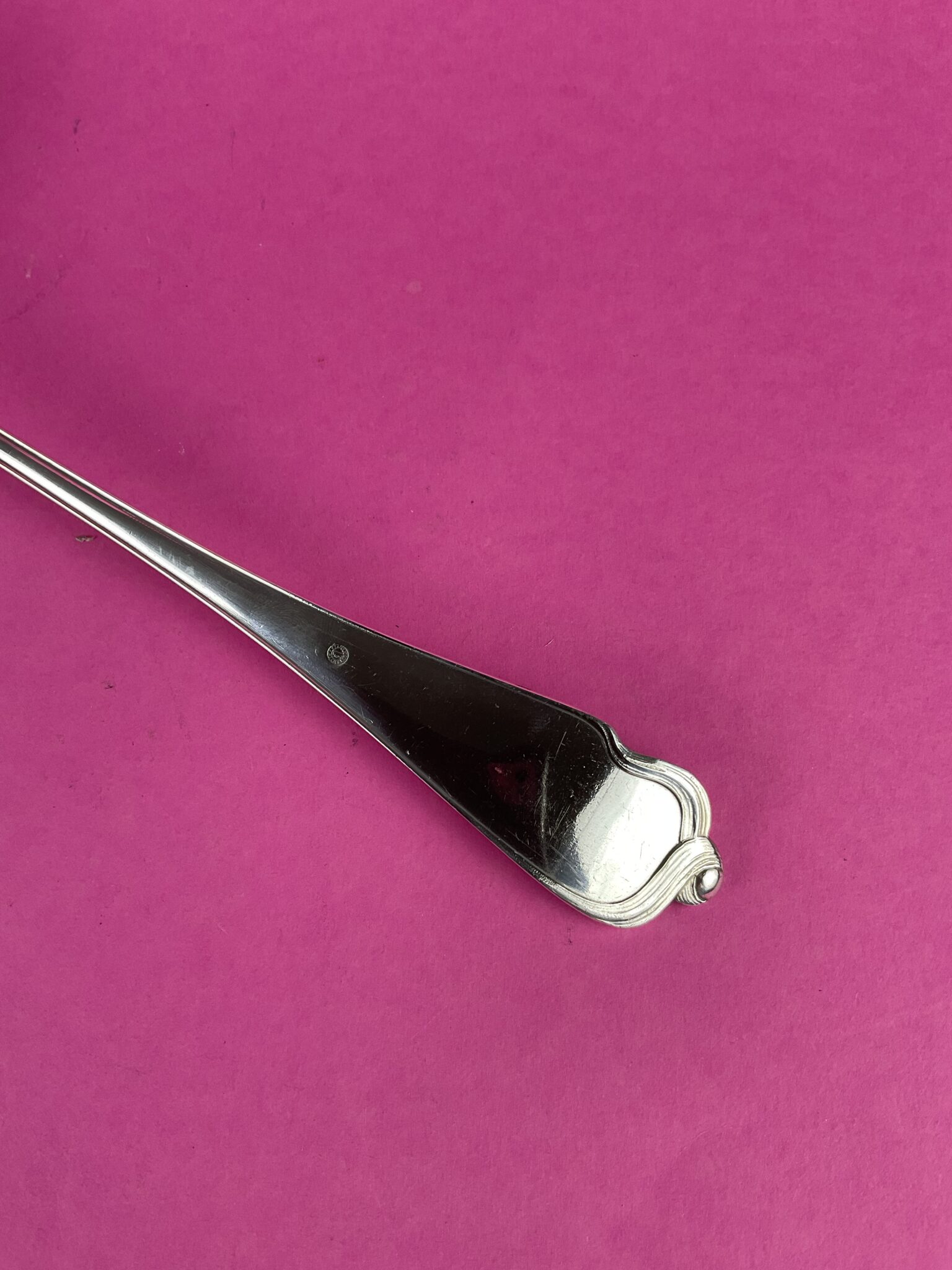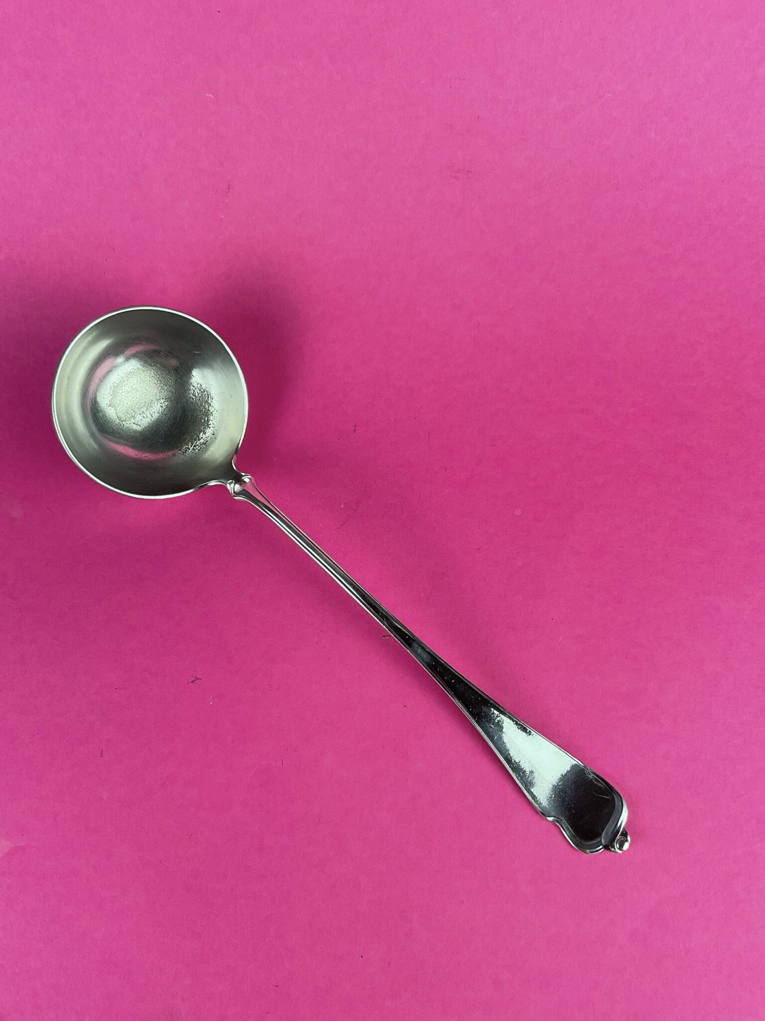 Alpacca, versilbert, Löffelstiel in Form Nr. 6500, gemarkt mit runder Firmenmarke, handpolierter Erhaltungszustand, Kelle innen mit Abrieb