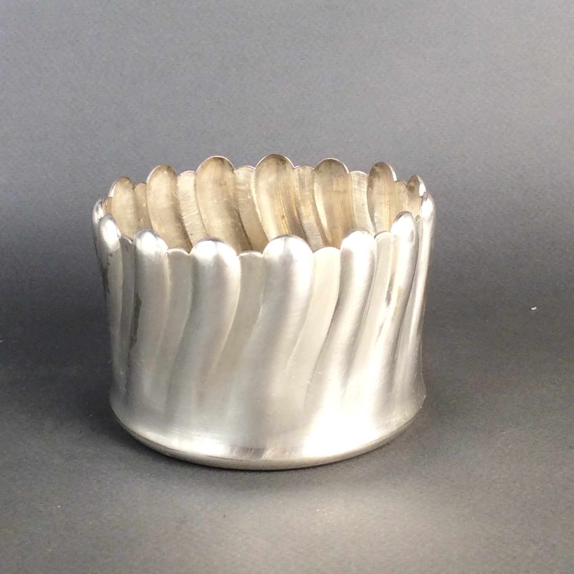 Alpacca, versilbert, runde Form, zylindrische Wandung mit Faltenzügen, am Boden gemarkt mit runder Bärenmarke, minimale Gebrauchsspuren