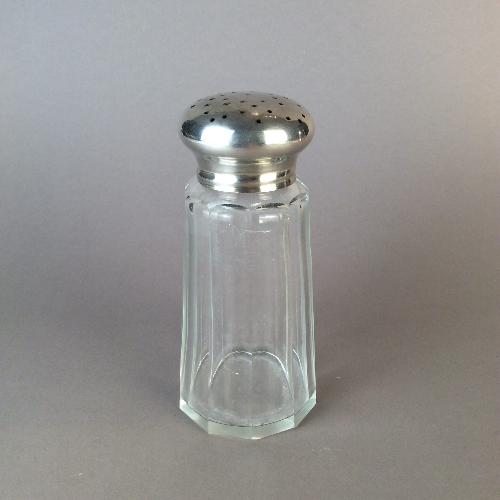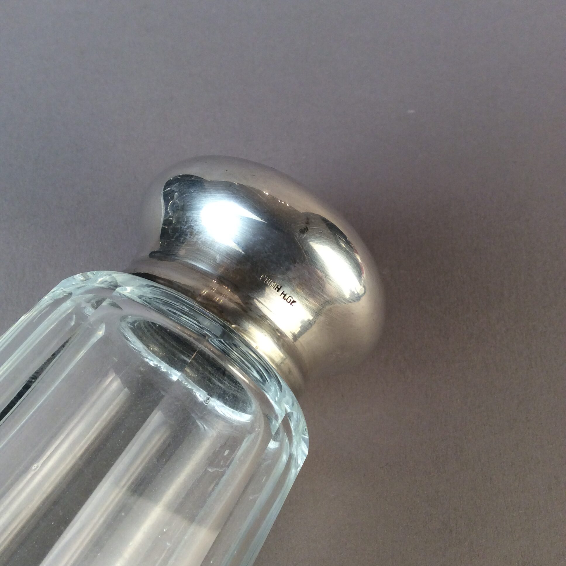 Alpacca, versilbert, 10 facettiert geschliffener Glaskörper mit Schrauverschluß, bombierter, perforierter Deckel, gemarkt PRIMA HGR