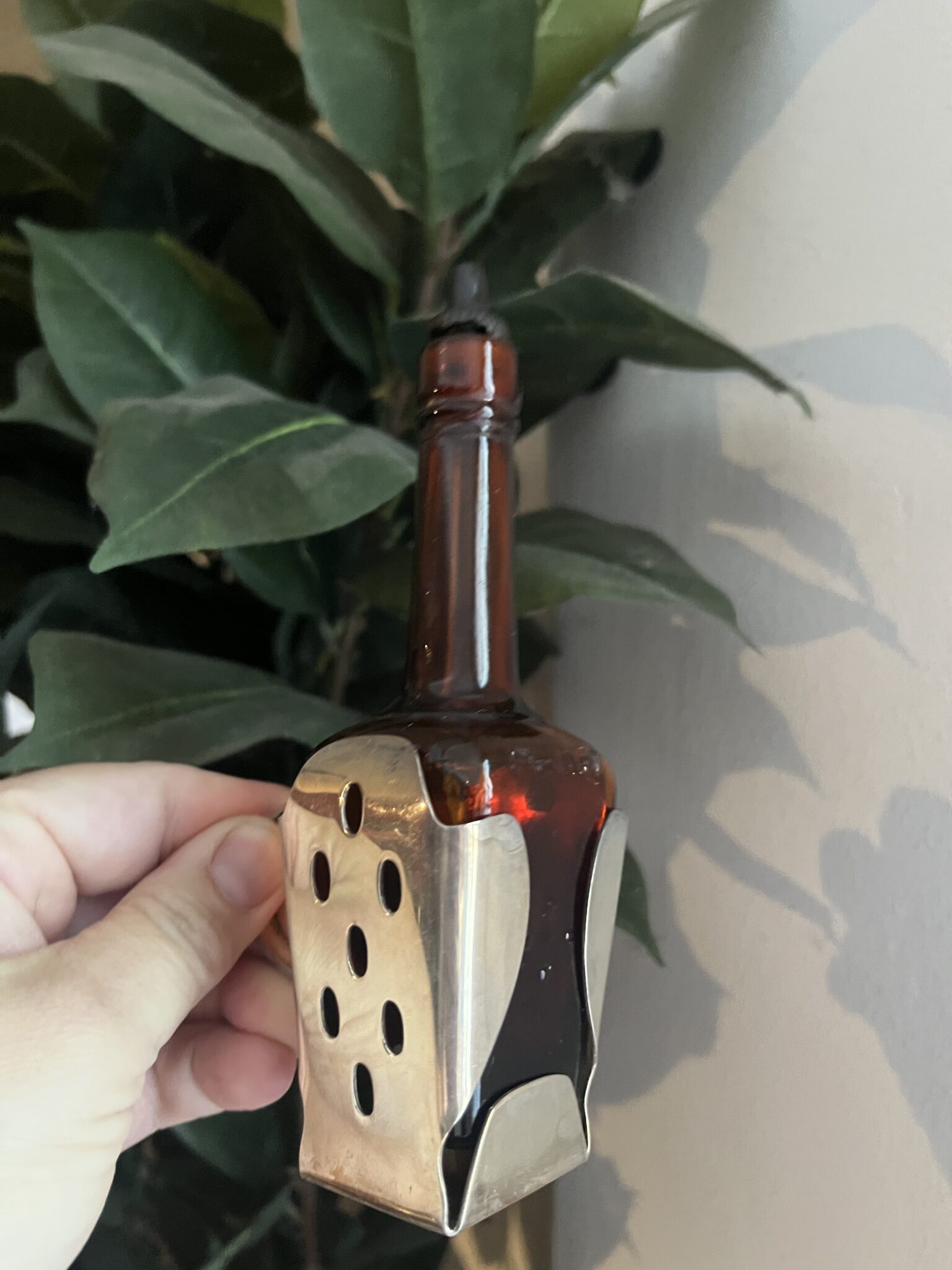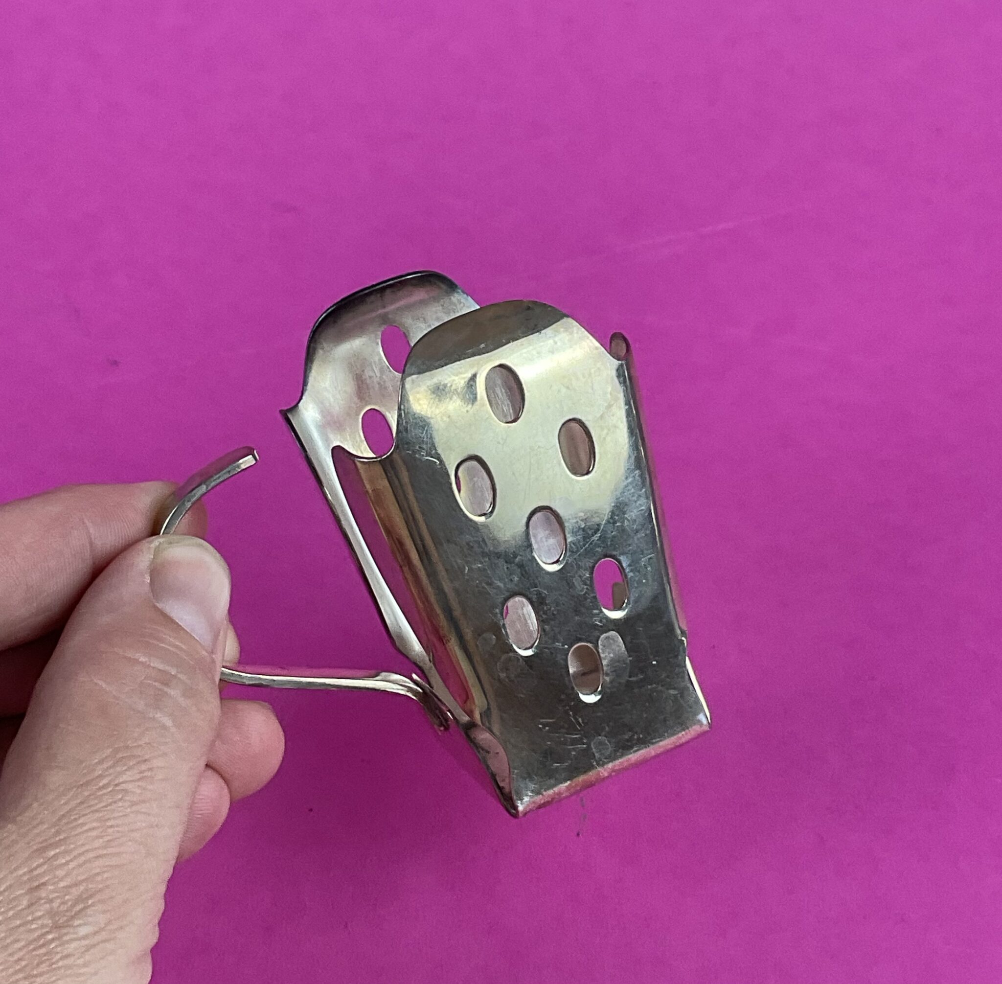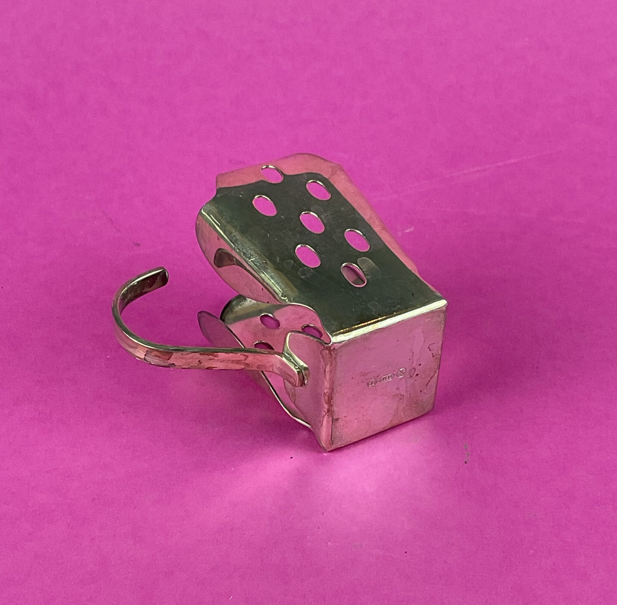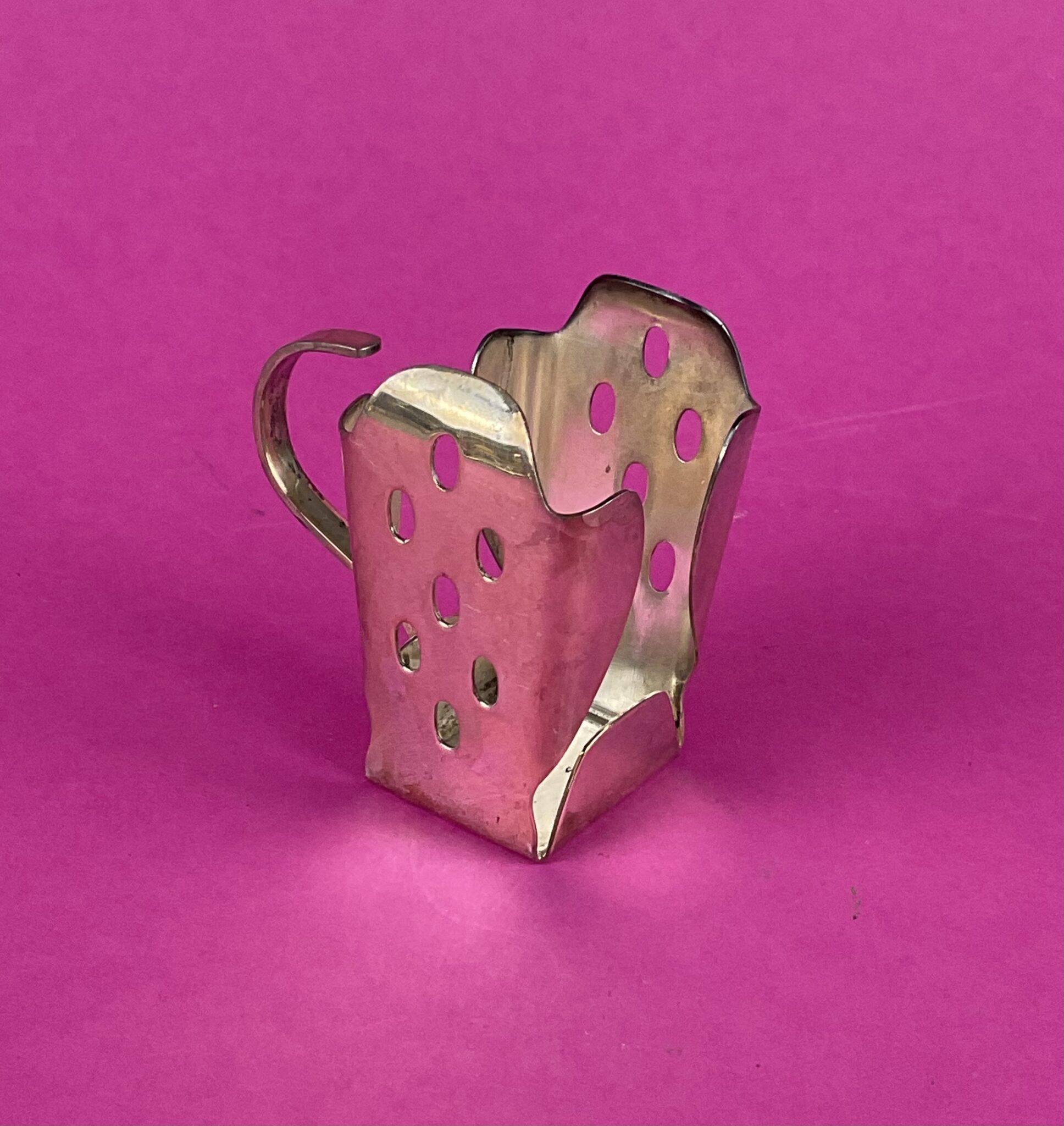 Alpacca, versilbert, quadratischer Gefäßhalter, seitlicher Henkel, gemarkt GERO, minimale Gebrauchsspuren