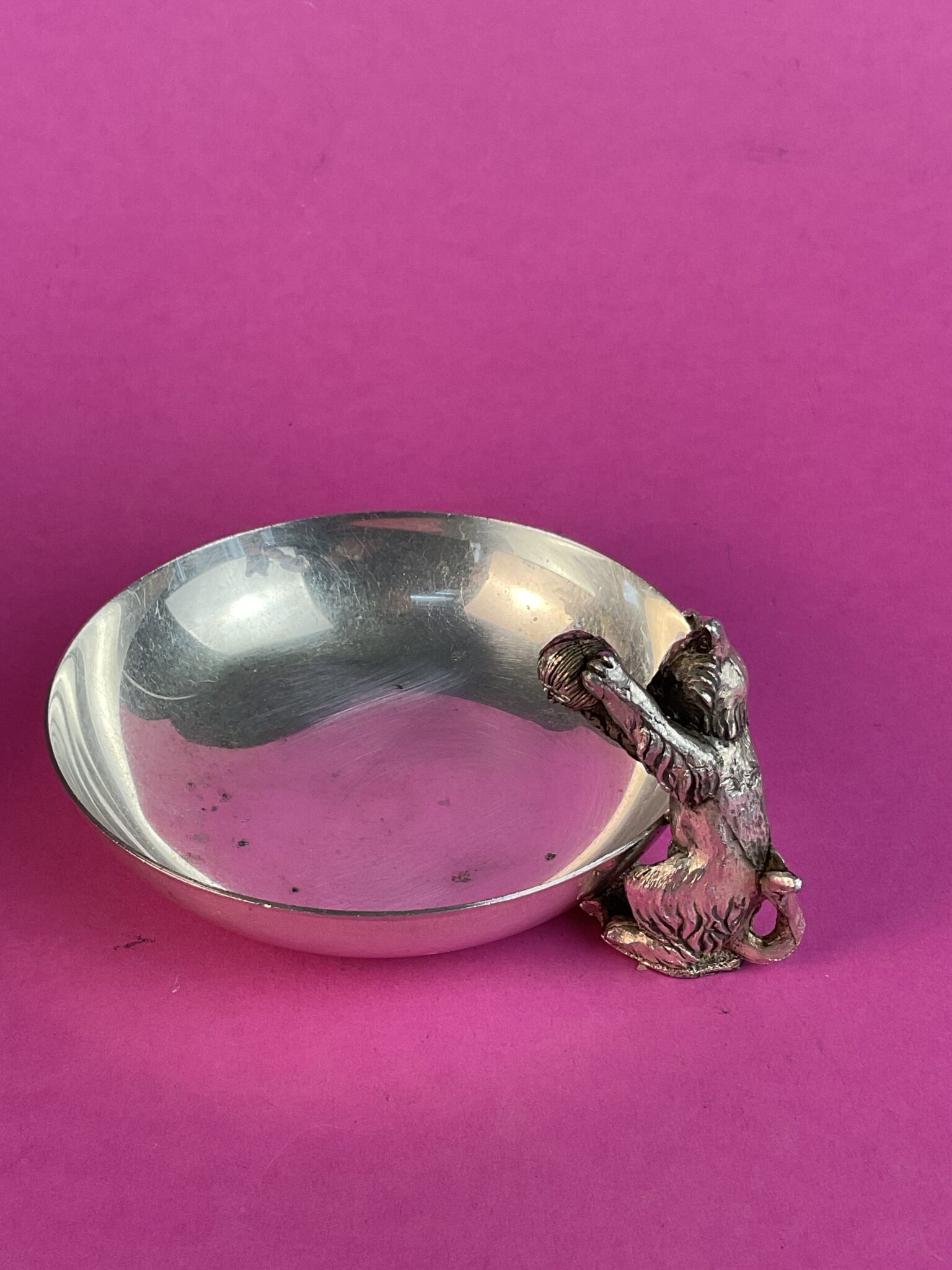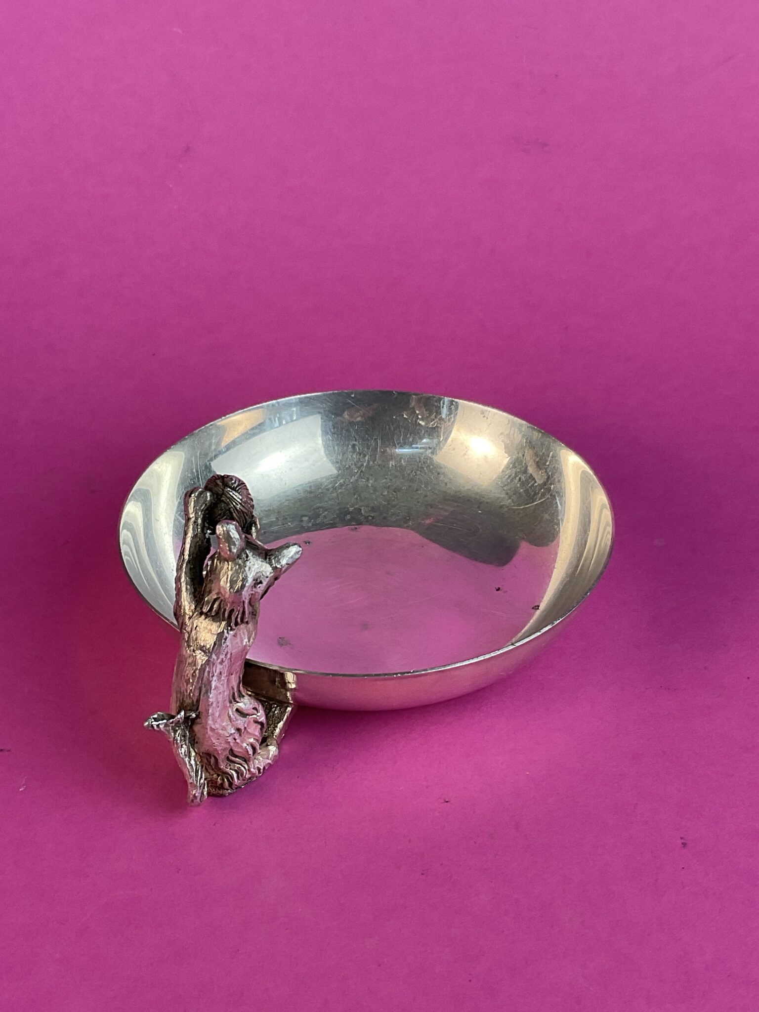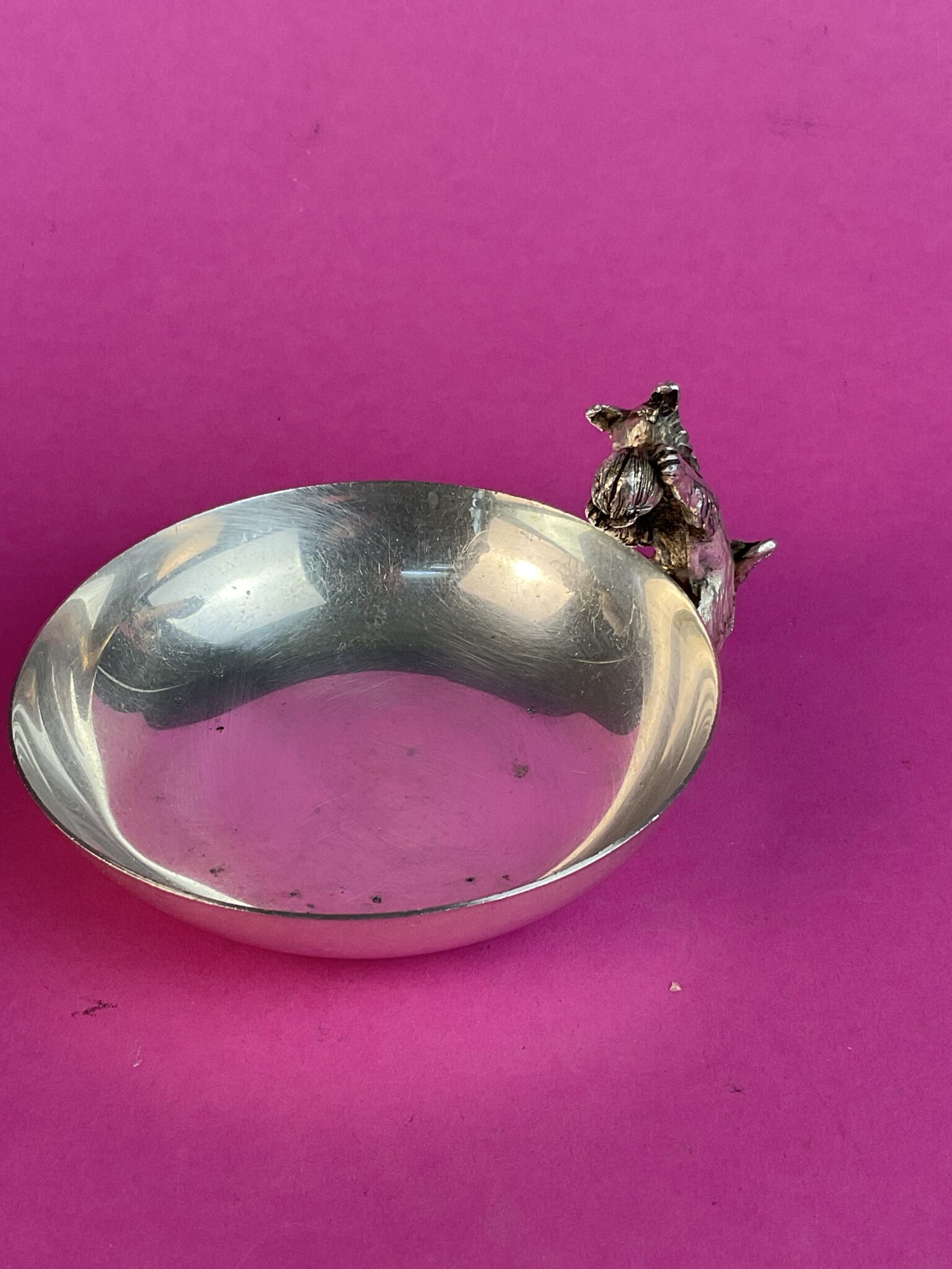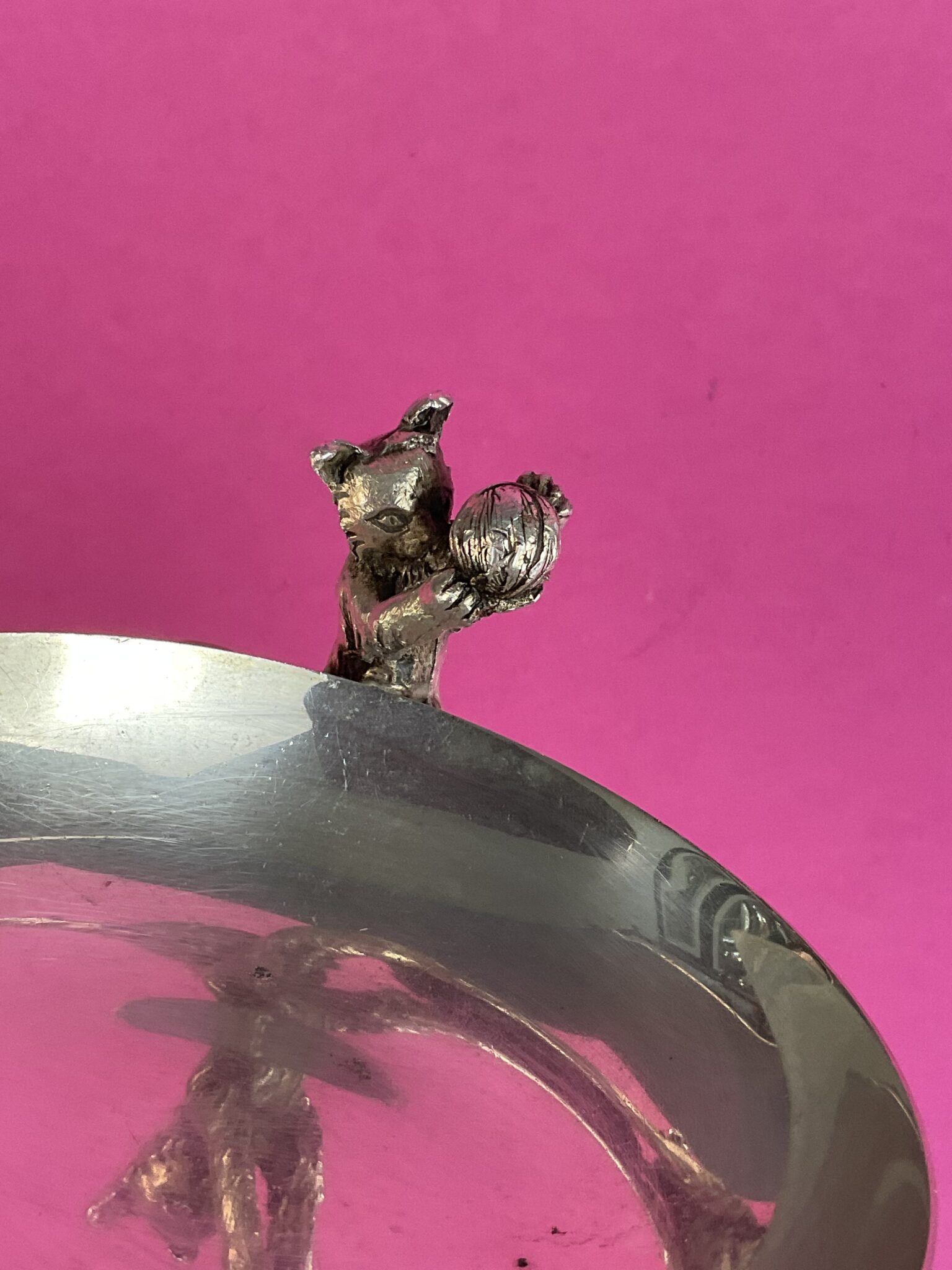 Alpacca, versilbert, runde Schale mit plastischer Katze als Griff gemarkt Reed & Barton, Gebrauchsspuren
