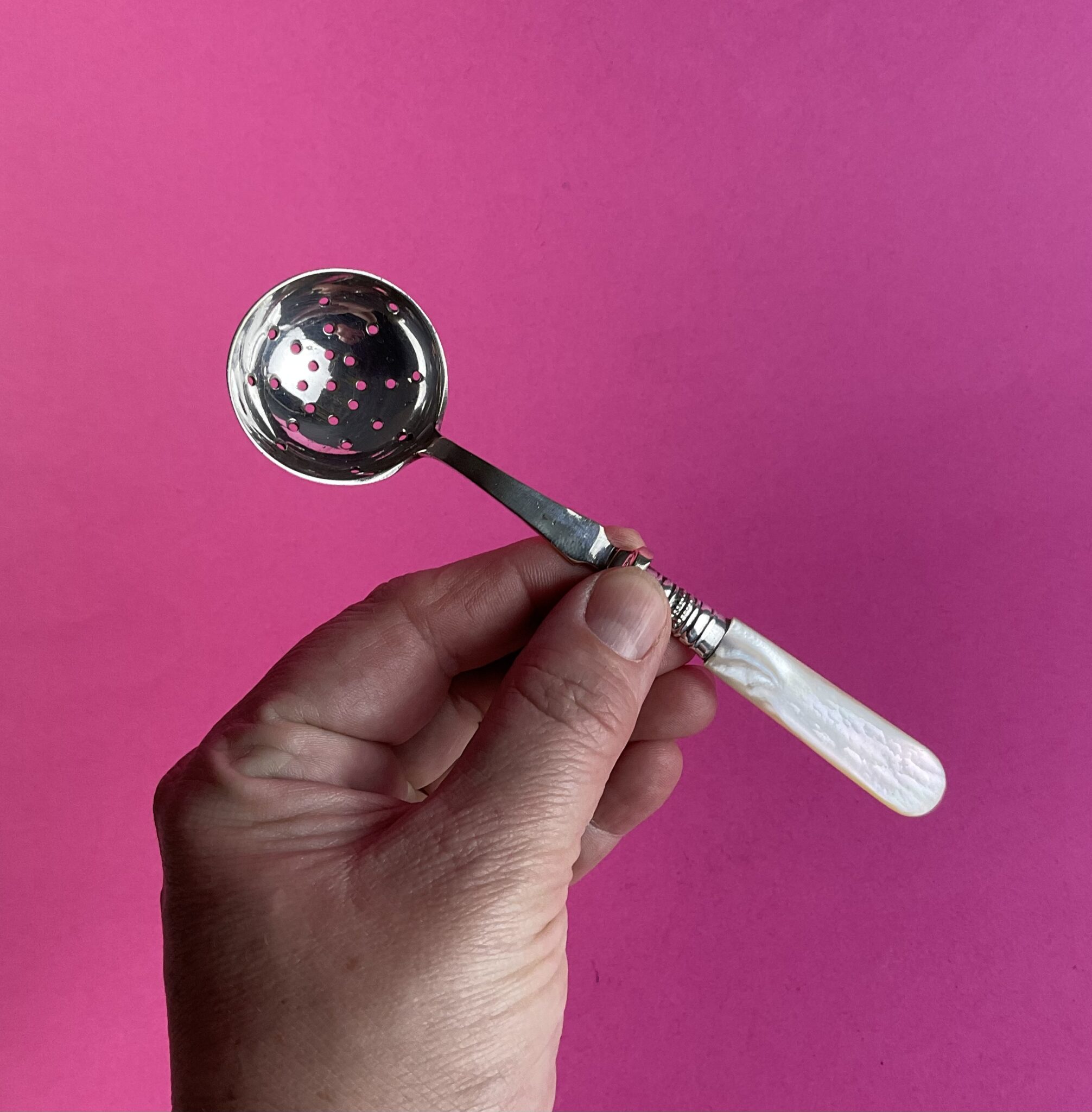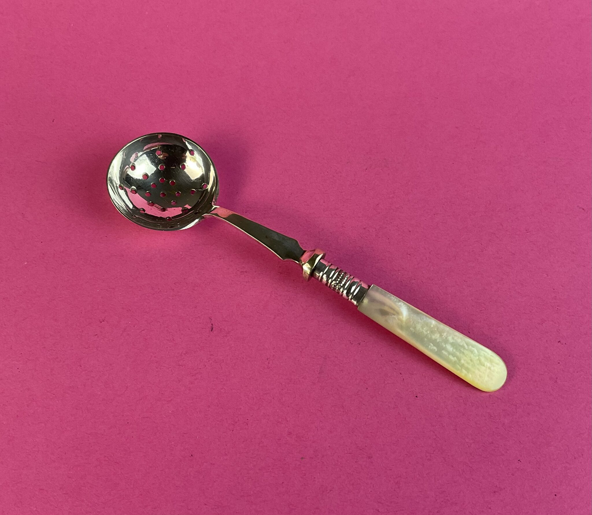 flache Hefte aus poliertem Perlmutt, versilberter Sieblöffel, ungemarkt, versilberter Haltering, handpolierter Erhaltungszustand