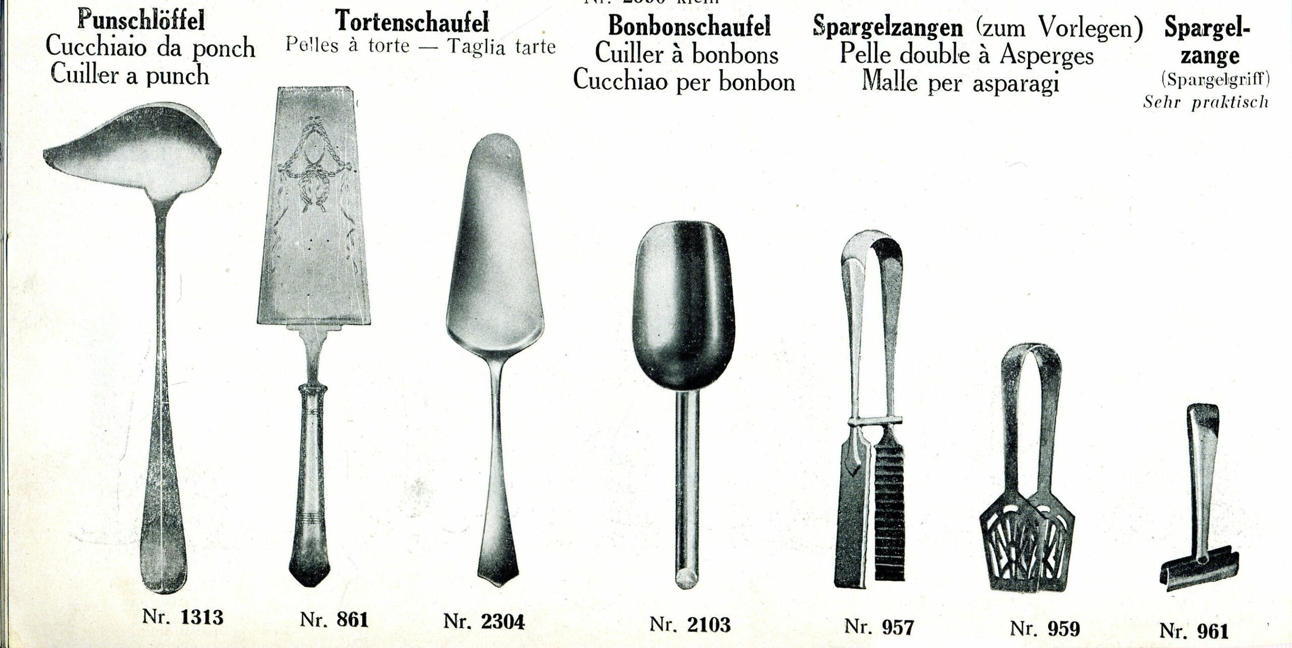 Annettes Etikette: Zur Geschichte der Firma von Moritz Hacker habe ich mir auf meinem Blog ausführliche Gedanken gemacht. Nun ist es mir auch gelungen zu einem Enkel des ursprünglichen Besitzers Kontakt zu bekommen.Der erhaltene Firmenkatalog der Firma Hacker in meinem Besitz gibt uns über die Vielfalt der angebotenen Besteckformen Auskunft. Diese Facon wurde bei Berndorf unter der Nummer „6800“ und wird heute unter dem Namen „Premiere“ vertrieben.