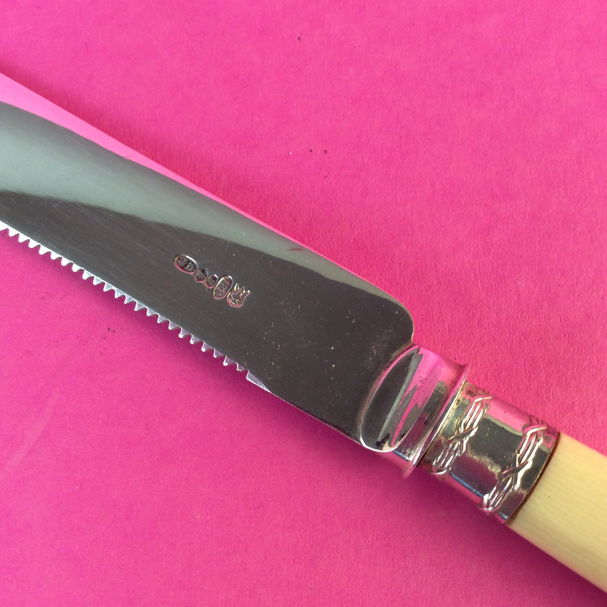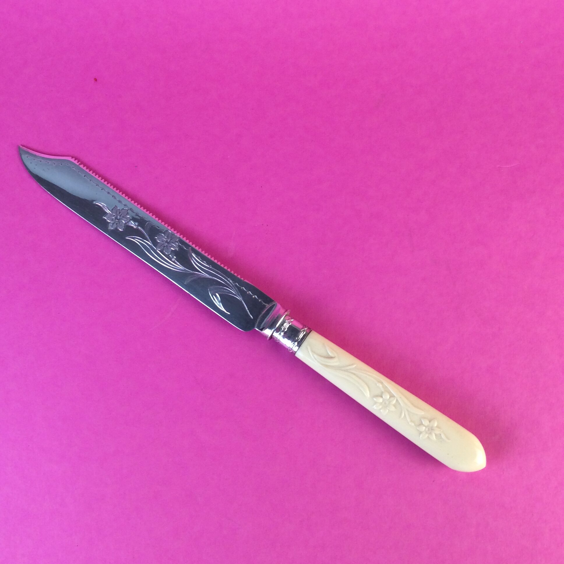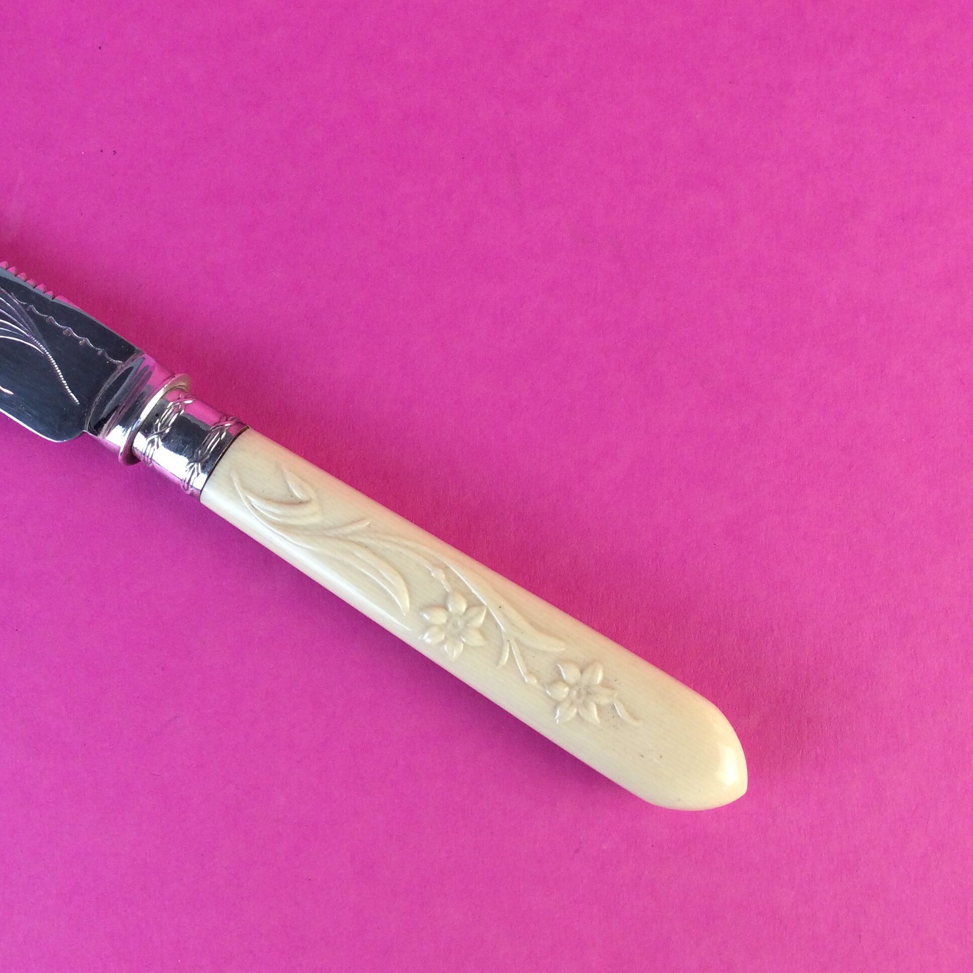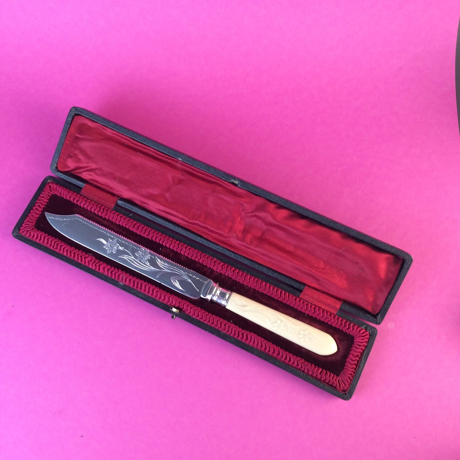 Hefte aus poliertem Bakelite, reliefierte Blüten und Blätter, gezackte Messerklinge aus versilberter Alpacca mit ornamentaler, korrespondierender Gravur, gemarkt, reliefierter Haltering mit Kreuzbandmotiv, in originaler Geschenkskassette aus Leder, innen aufwendig mit rotem Samt tapeziert