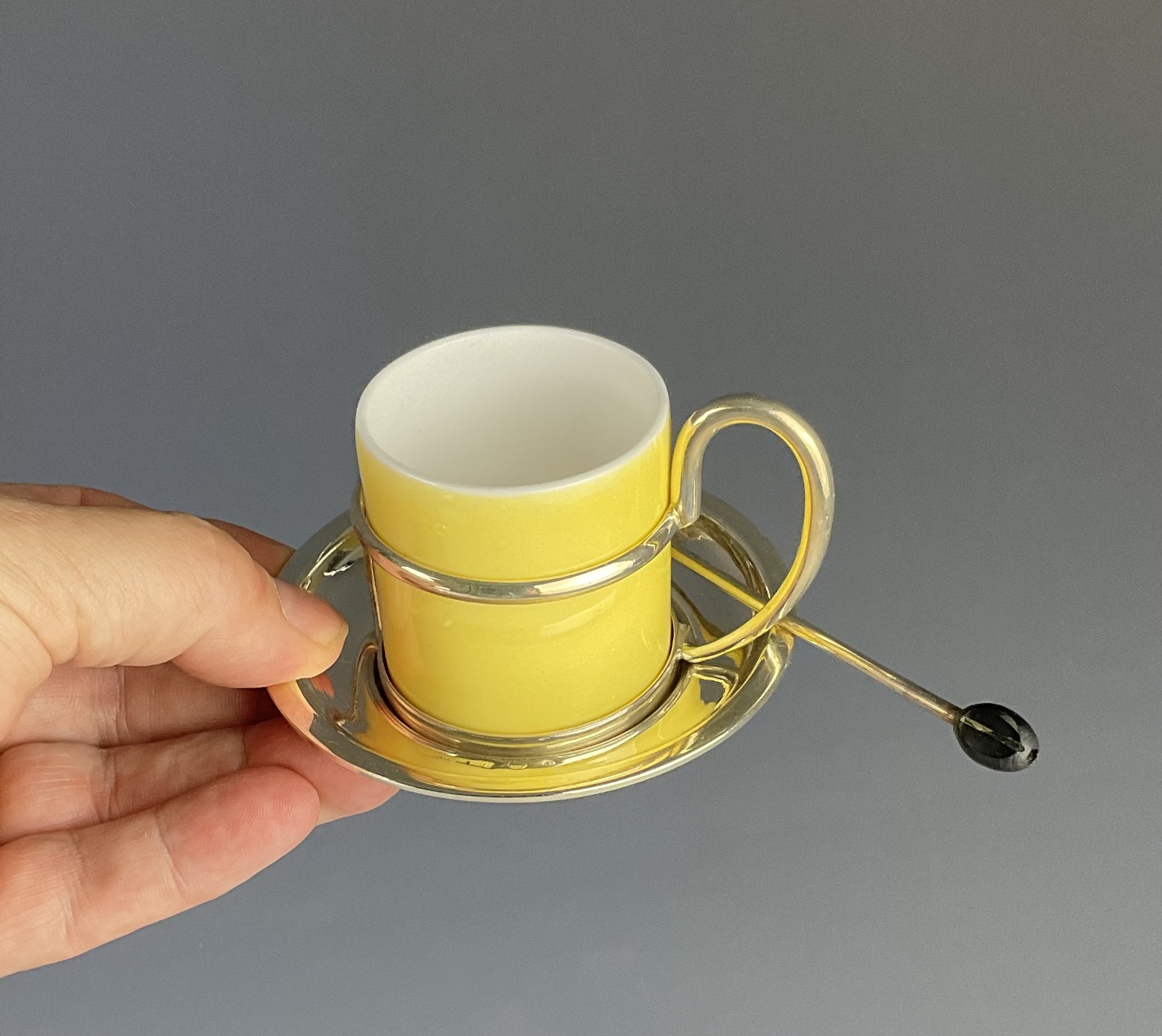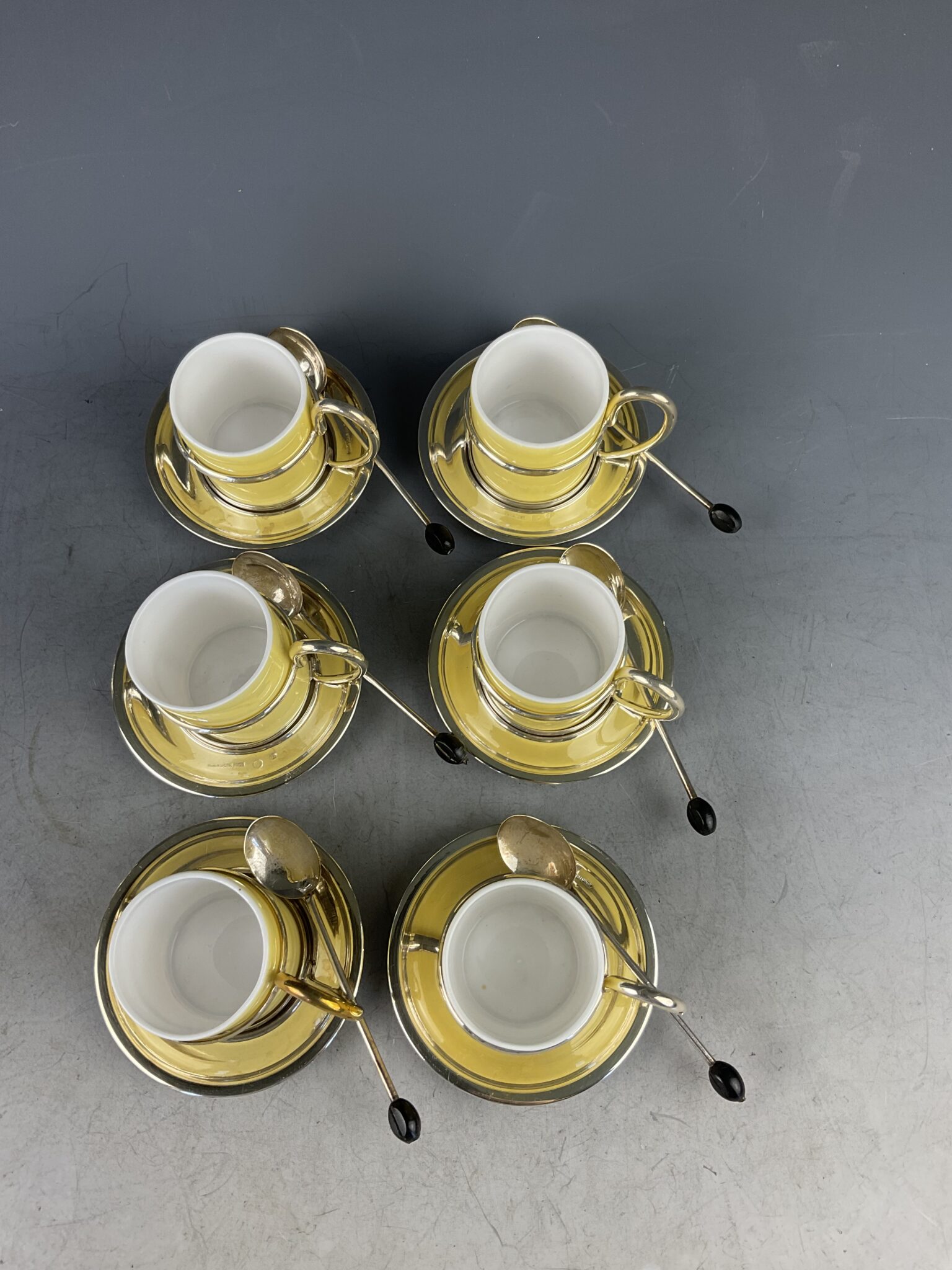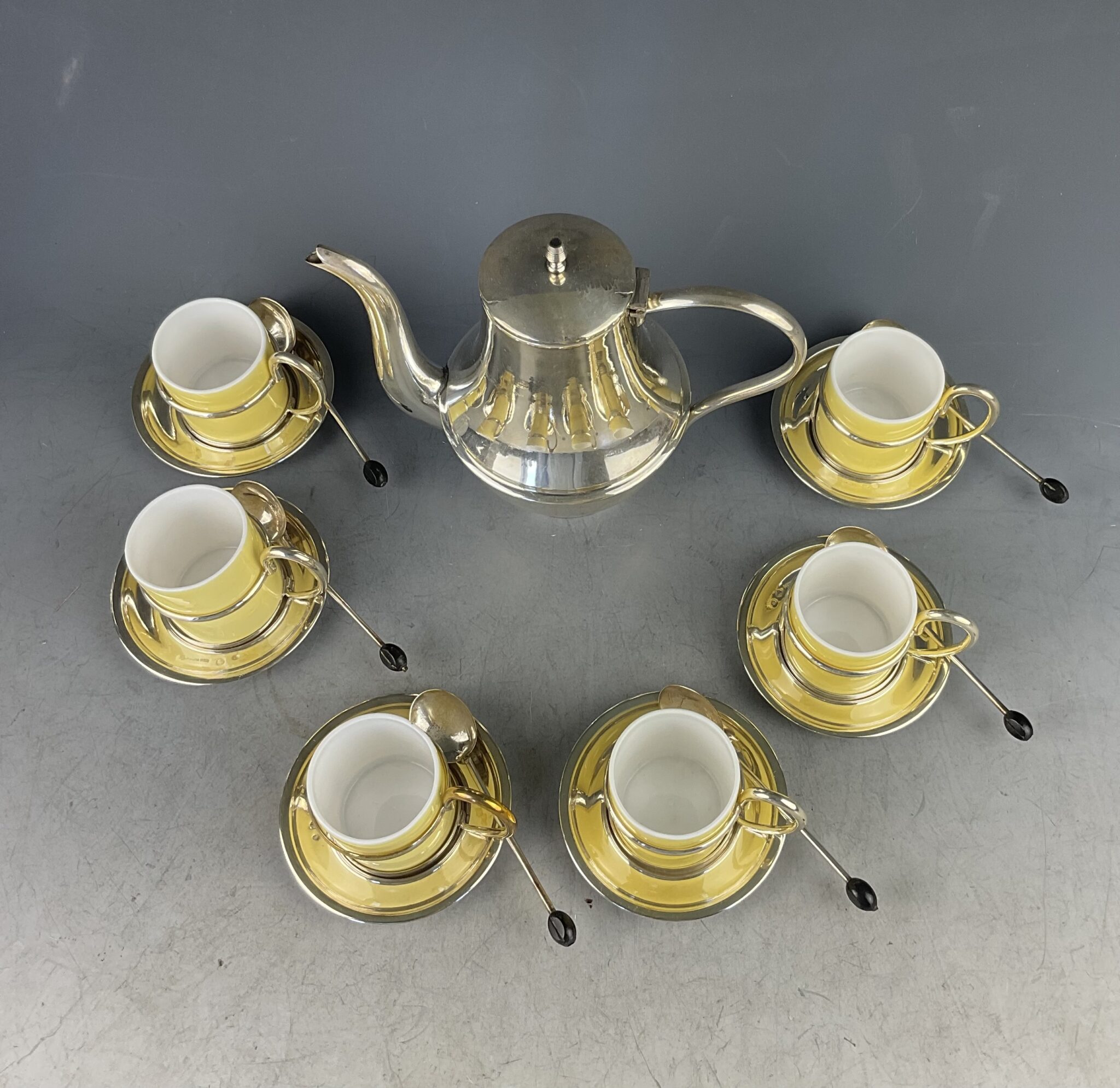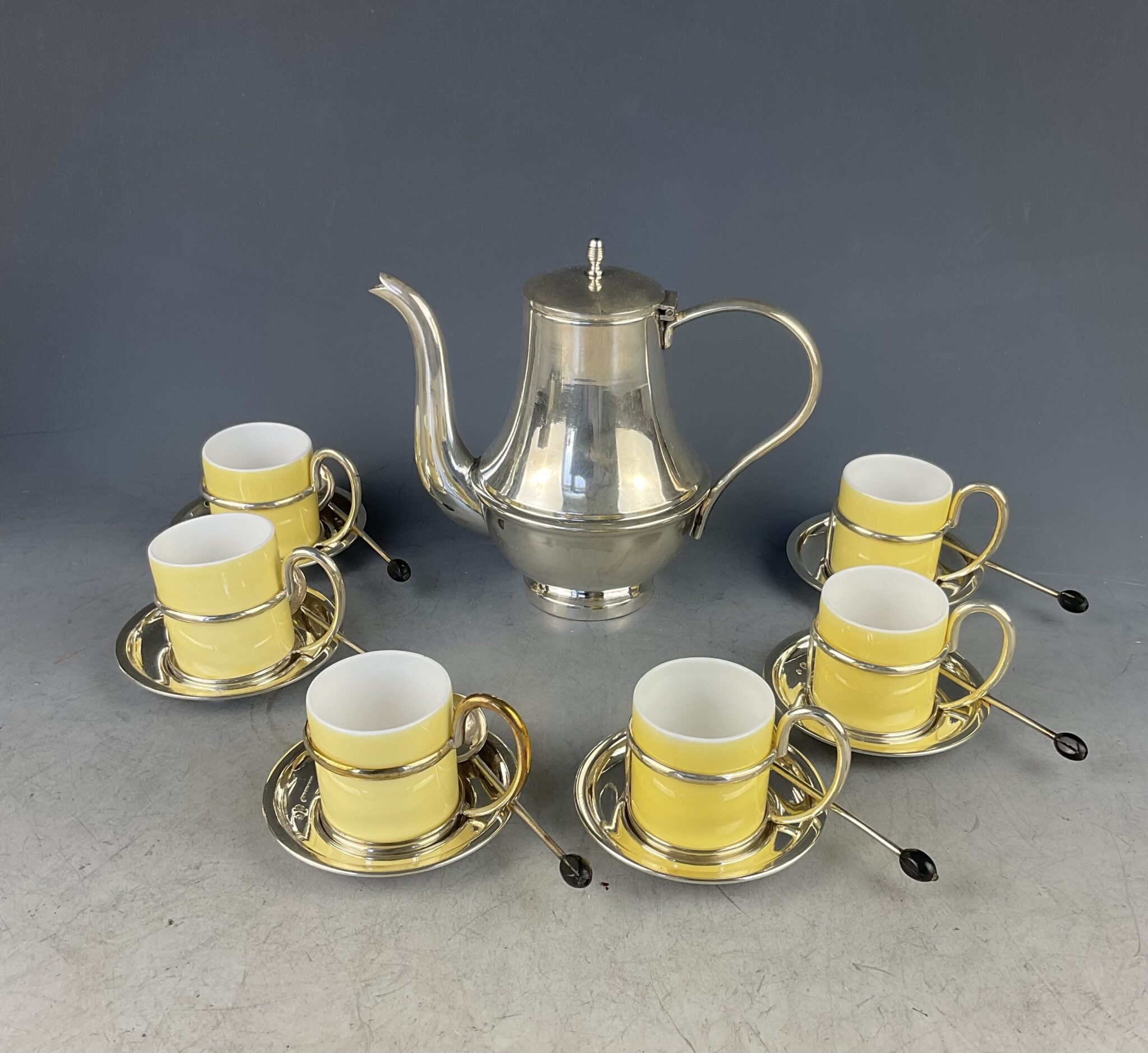 Alpacca, versilbert, bestehend aus Mokkakanne und 6 runden Mokkatassen-Haltern mit Einsätzen aus weissem Milchglas, außen gelb lasiert, Unterteller gemarkt ALBIN DENK WIEN tadelloser, polierter Zustand, zusätzlich sechs englische, versilberte Mokkalöffel mit Holzbohne als Stielabschluss (gemarkt EPNS)