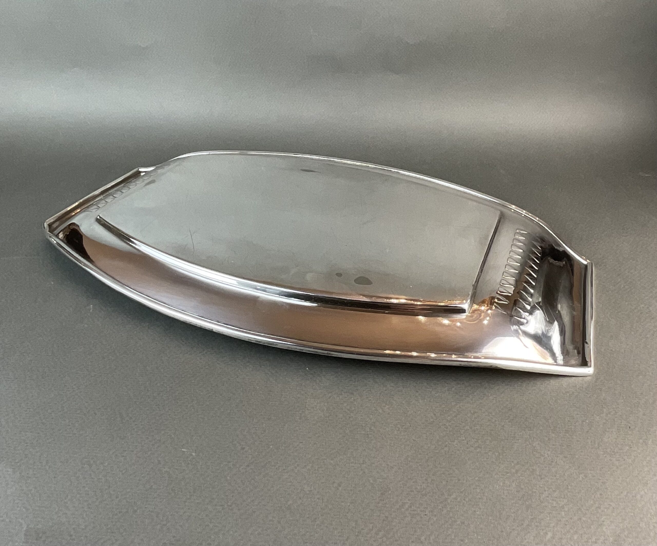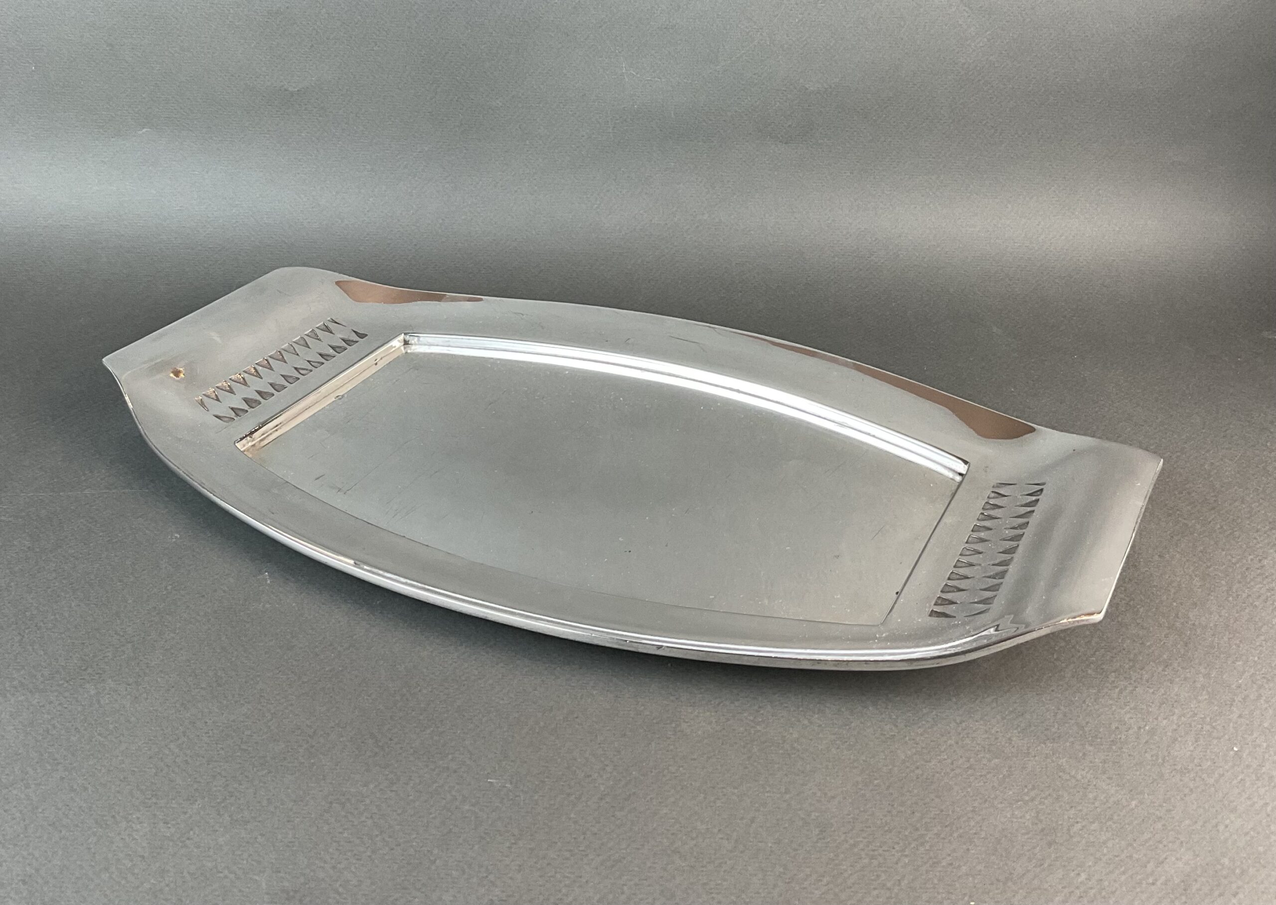 Alpacca, stark versilbert, glatter Spiegel, hochgezogene Handhaben, gemarkt mit runder Firmenmarke Berndorf, handpolierter Erhaltungszustand
