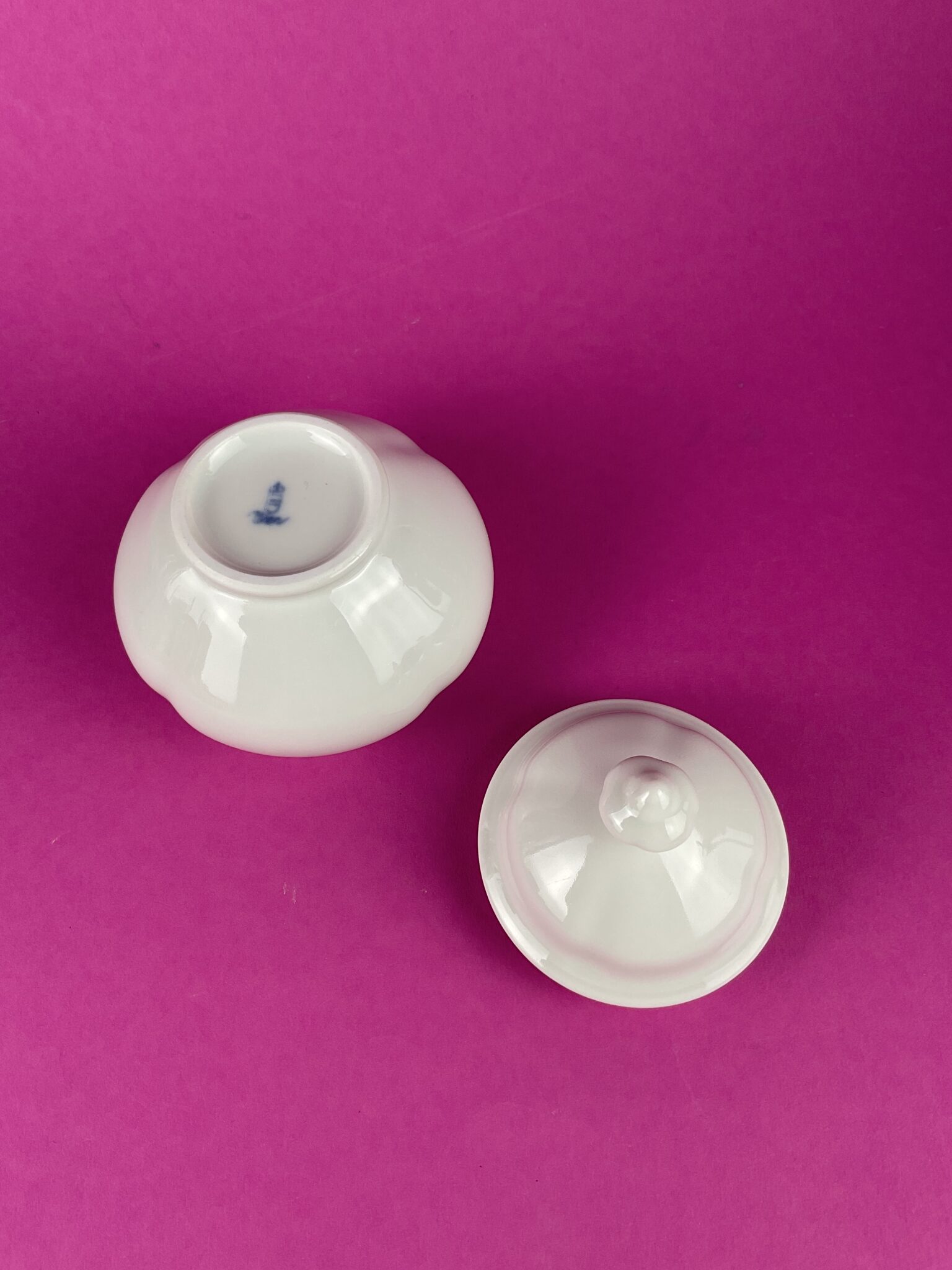 Porzellan, weiss glasiert, gebauchte Dose mit zugehörigem Deckel, am Boden gemarkt mit blauer Manufakturmarke, tadelloser Erhaltungszustand
